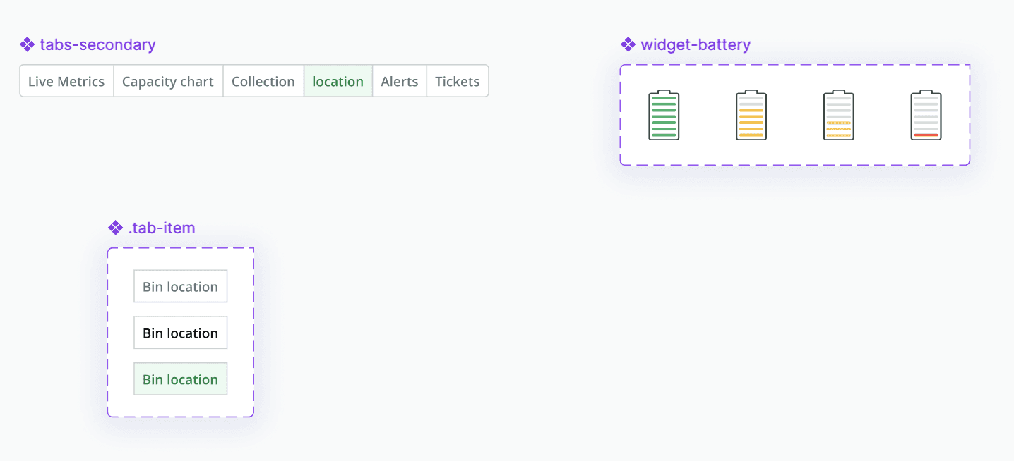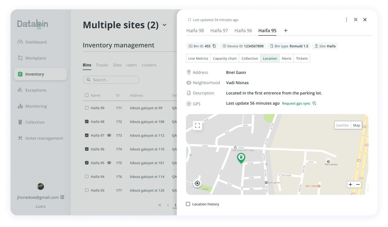 A second row of tabs lets users view live data for each bin like: metrics, location, and history keeping navigation clear and all information organized in one interface.